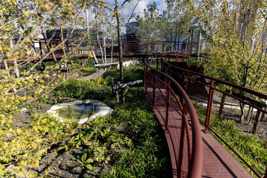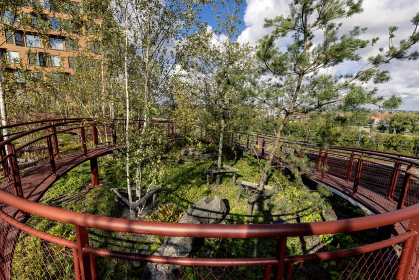 ist ein beeindruckendes Beispiel dafür, was ein großflächiges Dach leisten kann. Die Landschaft südlich von The Pulse steigt an und geht in einen Dachgarten von bisher unerreichter Größe über. Um das möglich zu machen, wurde die Konstruktion von Anfang an so geplant, dass sie eine hohe Dachlast aufnehmen kann, mit tiefen Pflanzbeeten, die direkt in das Design integriert wurden. Dadurch wurde das Tragwerk im Grunde zu einem riesigen Pflanzgefäß. Besonders eindrucksvoll ist das durchgehende Grün vom Erdgeschoss bis hinauf aufs Dach. Das Dach wird so tatsächlich Teil des dreidimensionalen Außenraums und macht das gesamte Gebäude zu einem festen Bestandteil der grünen Infrastruktur Amsterdams.